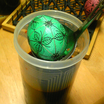 4.ピサンキーの染料に卵を10分ほど浸して染める。