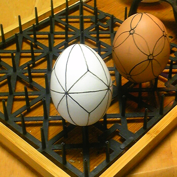 蜜蝋を中の器の中に溶かし入れ、卵に線を引いていく。